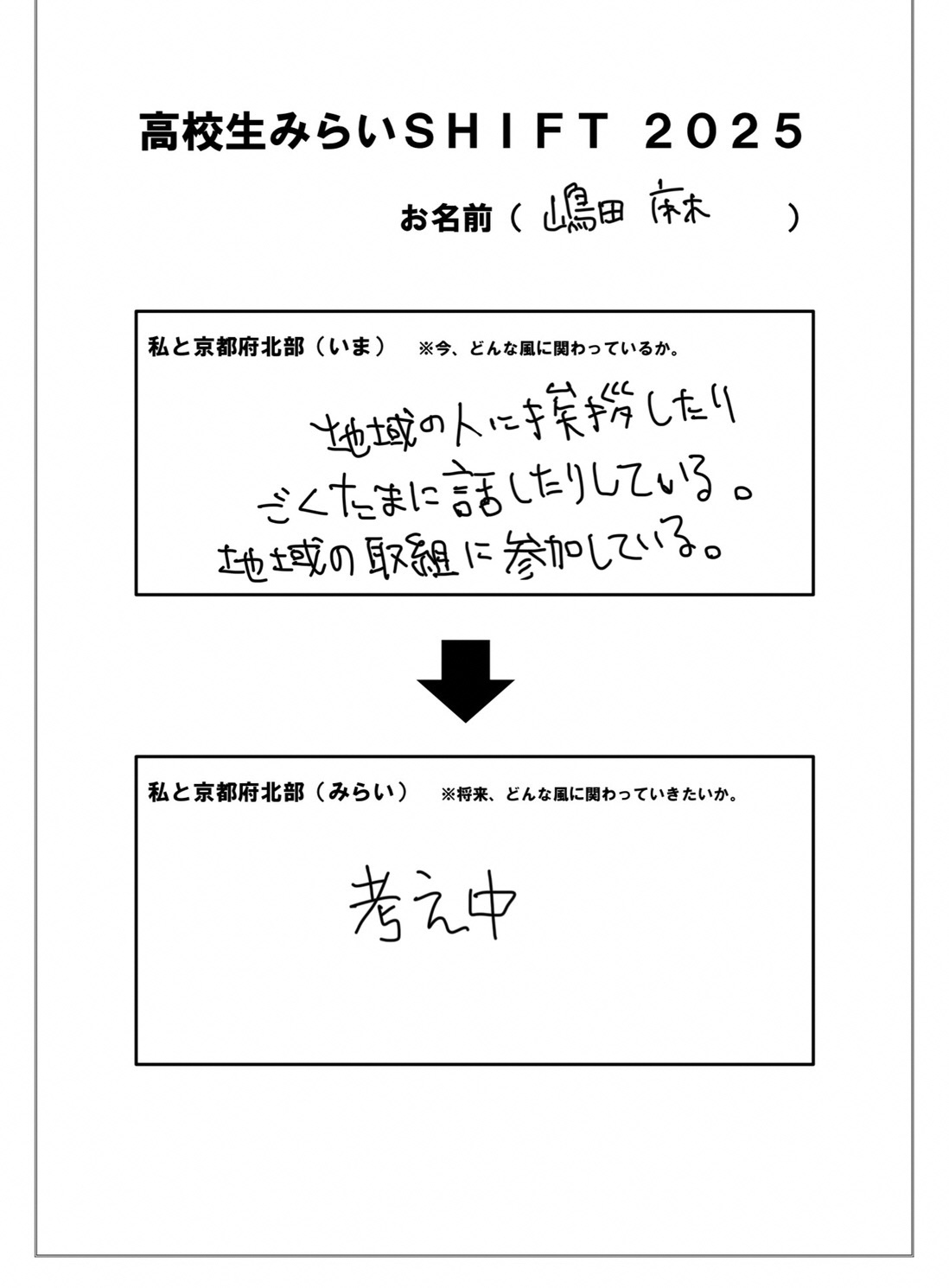 みらいの方が今これ考え中って書いてあるんですけど、それを考えてきました。みらいでは、地域の人達との関わりがもっと弱くなっていると思うので、この関わり方をもっと大事にしていこうと思っています。特に人との会話を大事にしたいと思っていて、みらい会議の講師の人たちがよくおっしゃっていた「自分から挑戦してみる」っていうことをして、人と話す機会を自分から作っていきたいと思っています。これで終わります。」