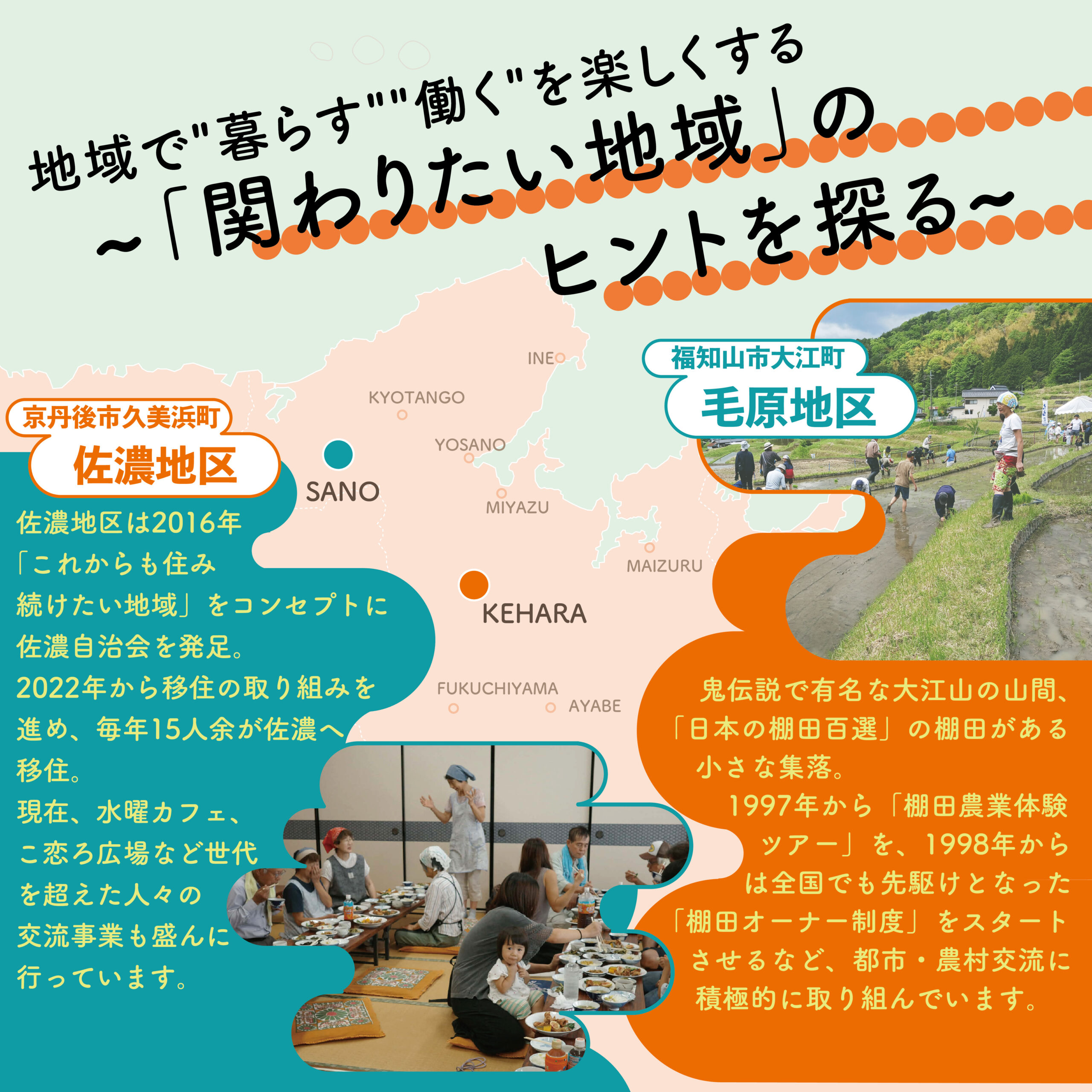 にとって、どうしてその地域に”関わりたい”と思ったの? どうだったから”関わりやすかった”の? を地元×移住者で取り組んでいる2地域《京丹後市久美浜町佐濃地区》、《福知山市大江町毛原地区》をお呼びし掘り下げます!地域に「関わりたい!」が増えるヒントが見つかるかも!?