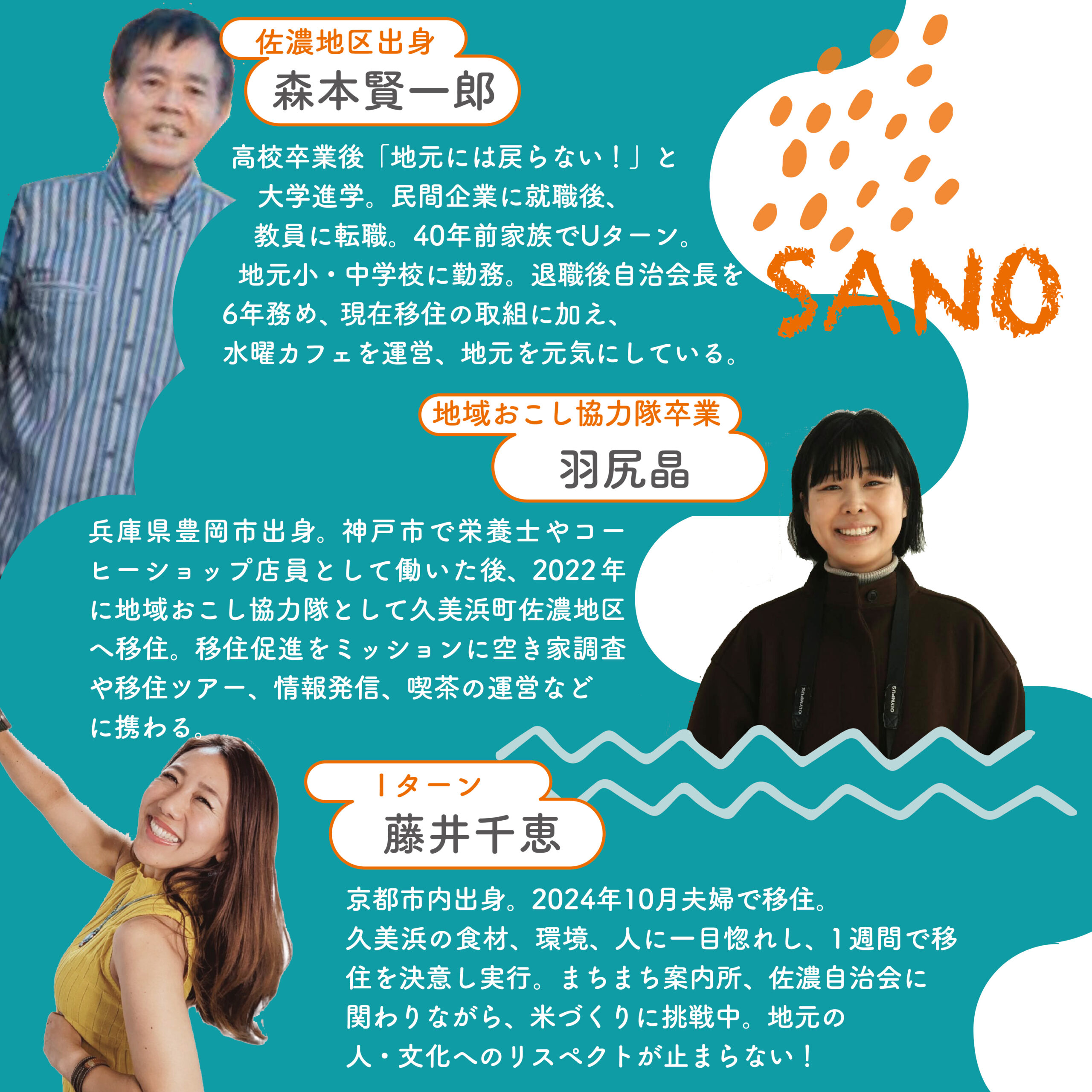 兵庫県豊岡市出身。神戸市で栄養士やコーヒーショップ店員として働いた後、2022年に地域おこし協力隊として久美浜町佐濃地区へ移住。移住促進をミッションに空き家調査や移住ツアー、情報発信、喫茶の運営など